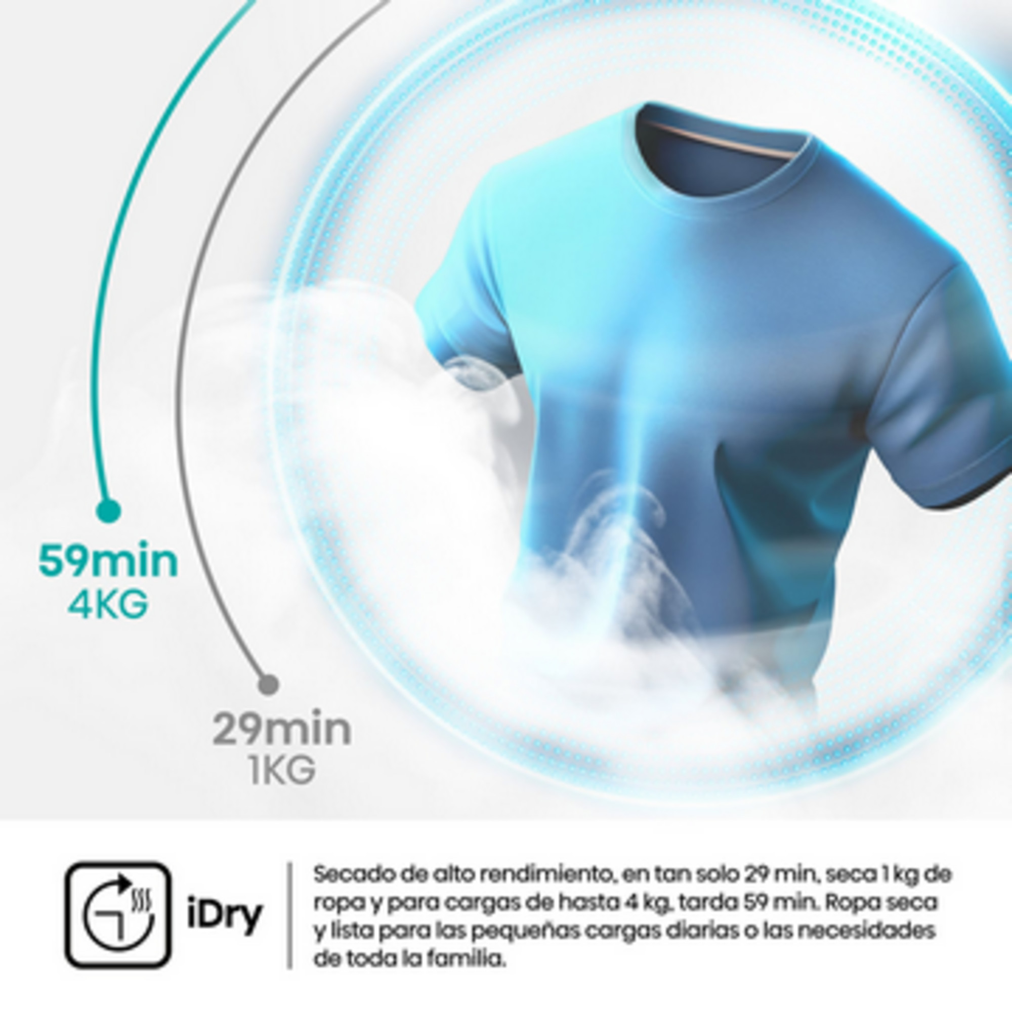 Secado de alto rendimiento, en tan solo 29 min, seca 1 kg de ropa y para cargas de hasta 4 kg, tarda 59 min. Ropa seca y lista para las pequeñas cargas diarias o las necesidades de toda la familia.