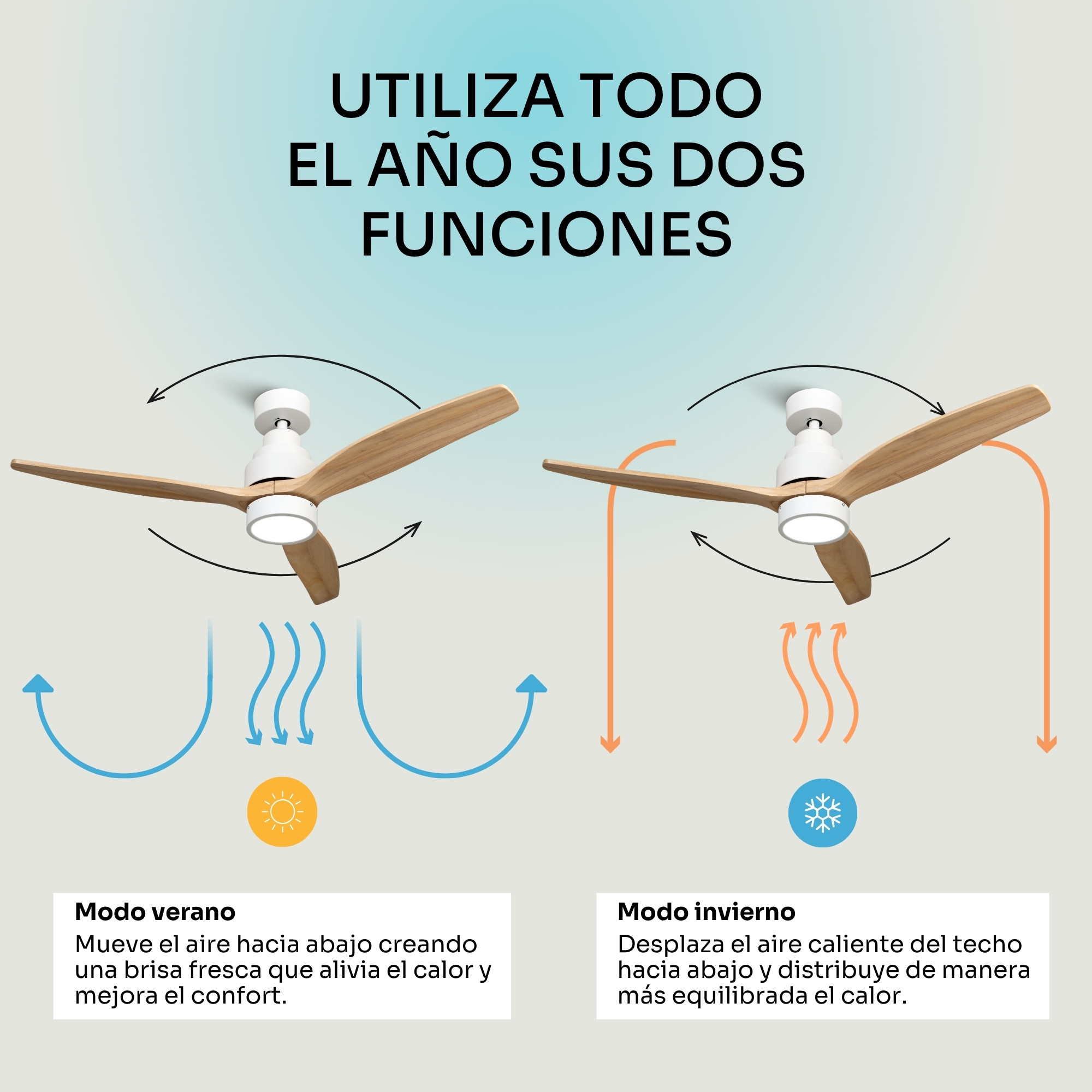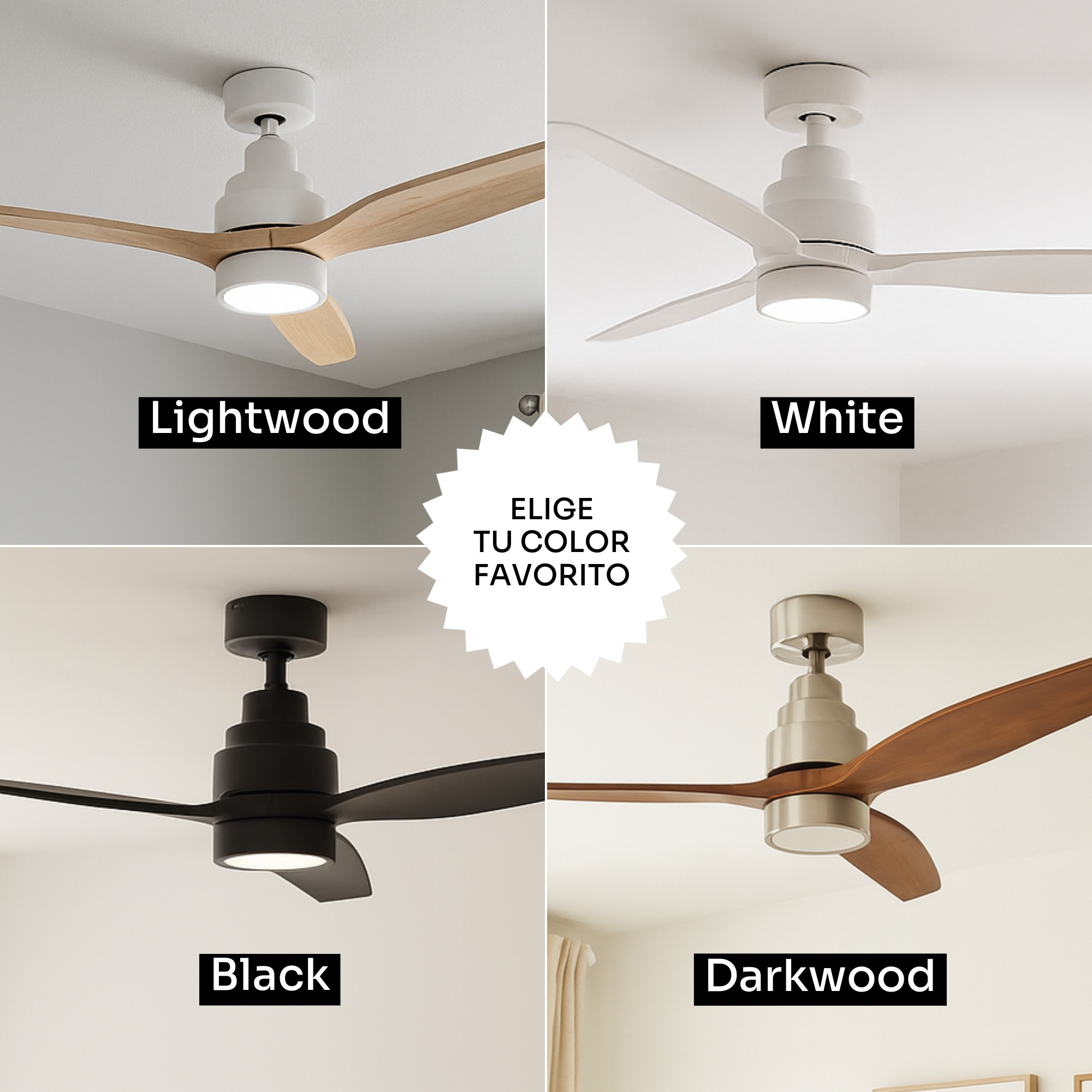 El cuerpo principal está diseñado de aluminio y las aspas de madera ultraligera. Tienes diferentes acabados y colores para que pueda encajar en cualquier estancia y en cualquier hogar. Apto para habitaciones de hasta 20m2.